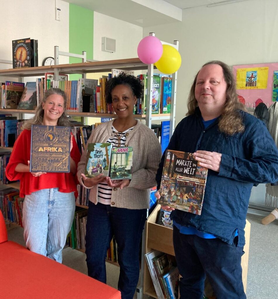 Im Januar durften das Bibliotheksteam und die Schulleitung Benjamin Strack-Zimmermann und Cathy Bazabas bei uns begrüßen und ihnen unsere Schulbücherei zeigen. Die ist nämlich dank der Bücherspende von Herrn Strack Zimmermann sehr viel moderner, aufregender und diverser geworden.