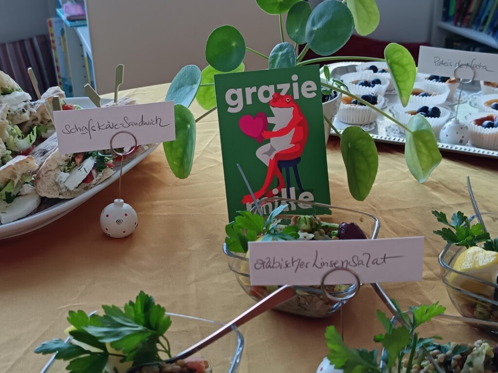 Nach einem leckeren Catering von Schüler*innen der M2 und M5 haben wir noch ein bisschen gestöbert und gemeinsam einige unserer Lieblingsbücher aus den Regalen gesucht.